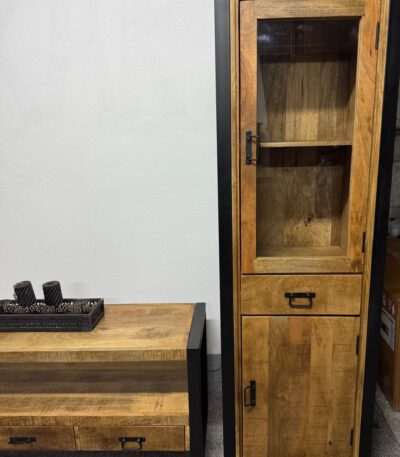 Każdy element kolekcji — od masywnych komód po stylowe regały i szafki — został wykonany ręcznie z litego, naturalnego drewna mango, którego unikalne usłojenie nadaje każdemu meblowi indywidualny, niepowtarzalny wygląd. Czarne stalowe detale i przesuwne drzwi na prowadnicach inspirowane są stylem przemysłowych warsztatów, co tworzy wyjątkowy kontrast pomiędzy surowością metalu a ciepłem drewna.