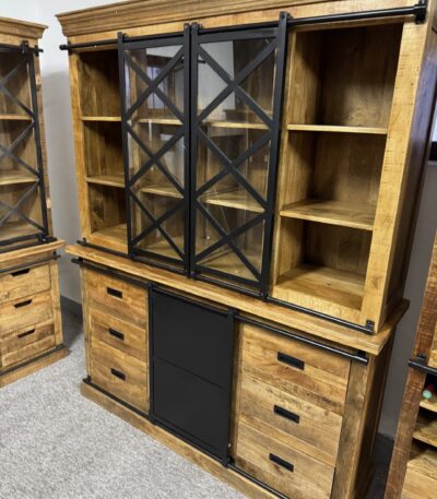 Każdy element tej kolekcji wykonany jest ręcznie z naturalnego drewna mango o pięknym, złocistym rysunku słojów. Czarna stalowa konstrukcja i przesuwne drzwi na metalowych prowadnicach nadają im wyjątkowego, fabrycznego stylu – solidnego, ale z duszą.