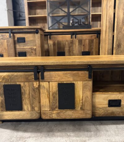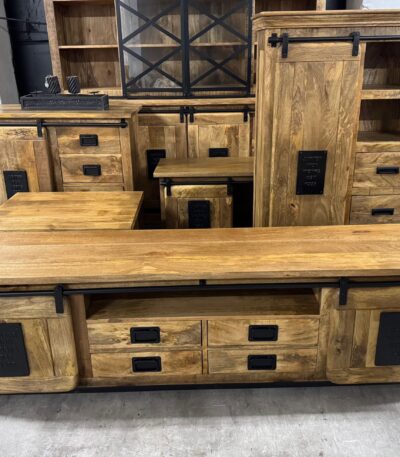 Każdy element kolekcji — od masywnych komód po stylowe regały i szafki — został wykonany ręcznie z litego, naturalnego drewna mango, którego unikalne usłojenie nadaje każdemu meblowi indywidualny, niepowtarzalny wygląd. Czarne stalowe detale i przesuwne drzwi na prowadnicach inspirowane są stylem przemysłowych warsztatów, co tworzy wyjątkowy kontrast pomiędzy surowością metalu a ciepłem drewna.