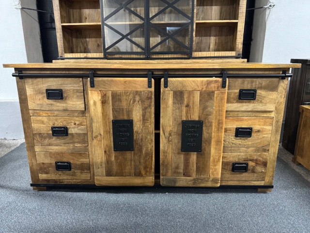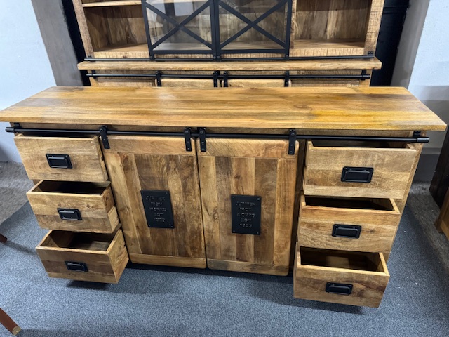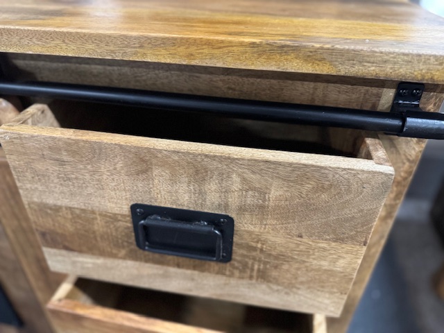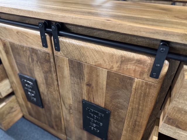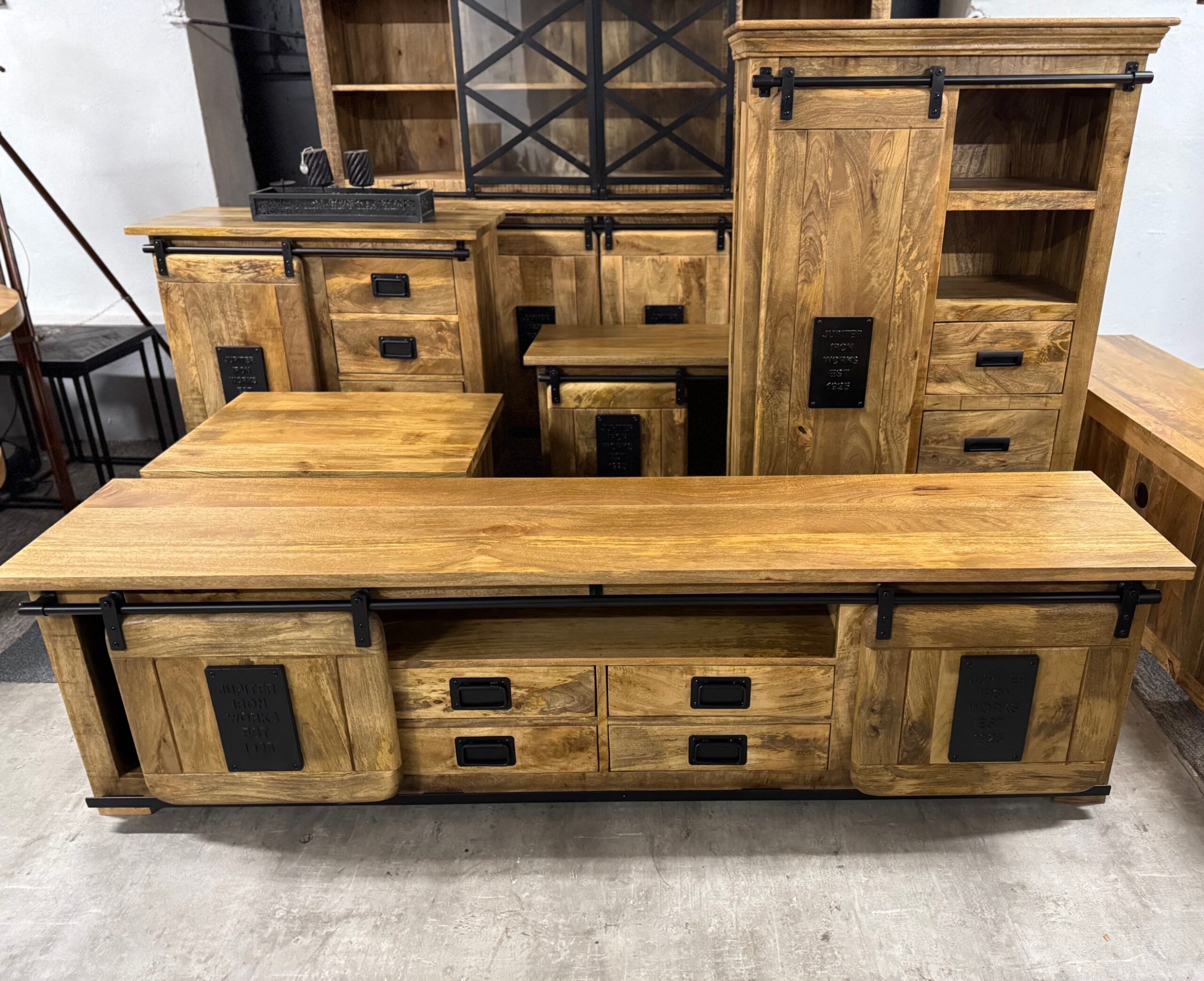 Każdy element kolekcji — od masywnych komód po stylowe regały i szafki — został wykonany ręcznie z litego, naturalnego drewna mango, którego unikalne usłojenie nadaje każdemu meblowi indywidualny, niepowtarzalny wygląd. Czarne stalowe detale i przesuwne drzwi na prowadnicach inspirowane są stylem przemysłowych warsztatów, co tworzy wyjątkowy kontrast pomiędzy surowością metalu a ciepłem drewna.