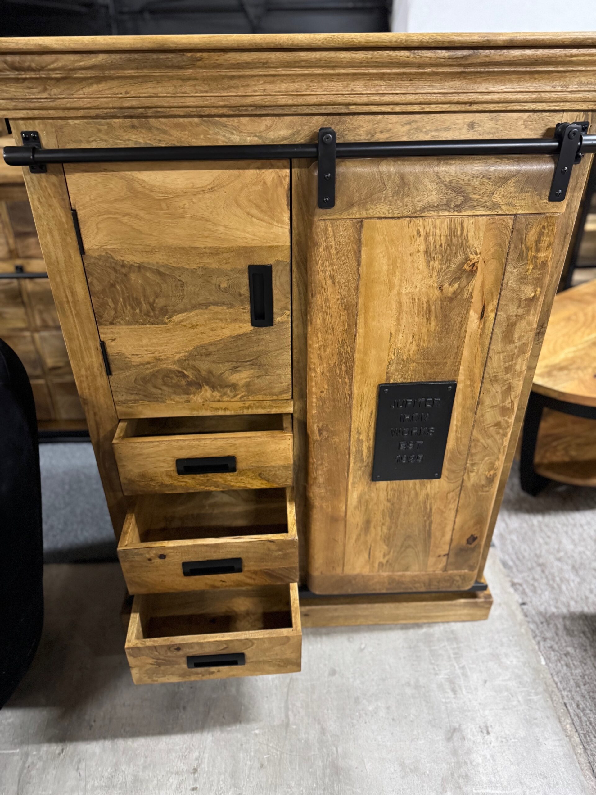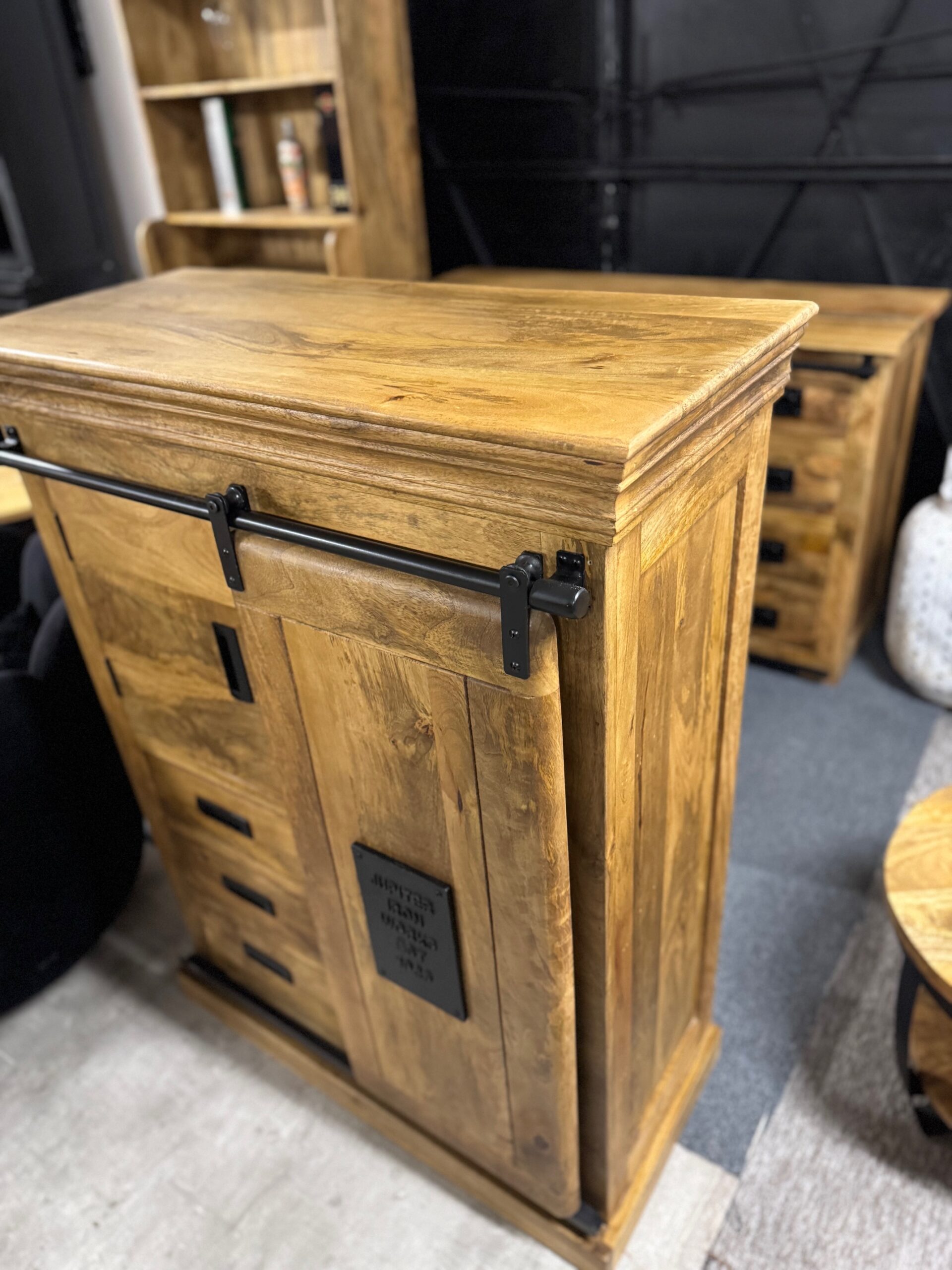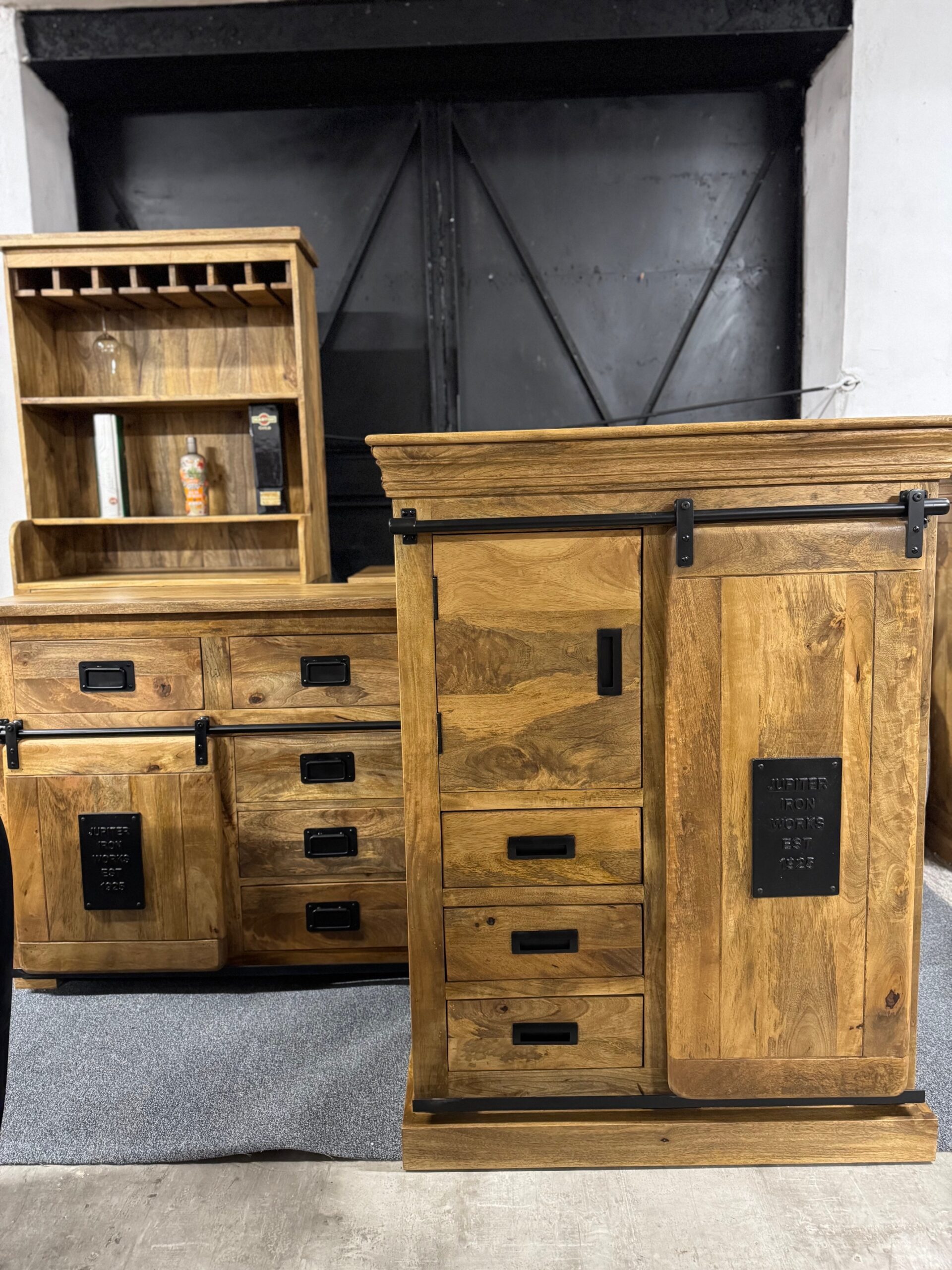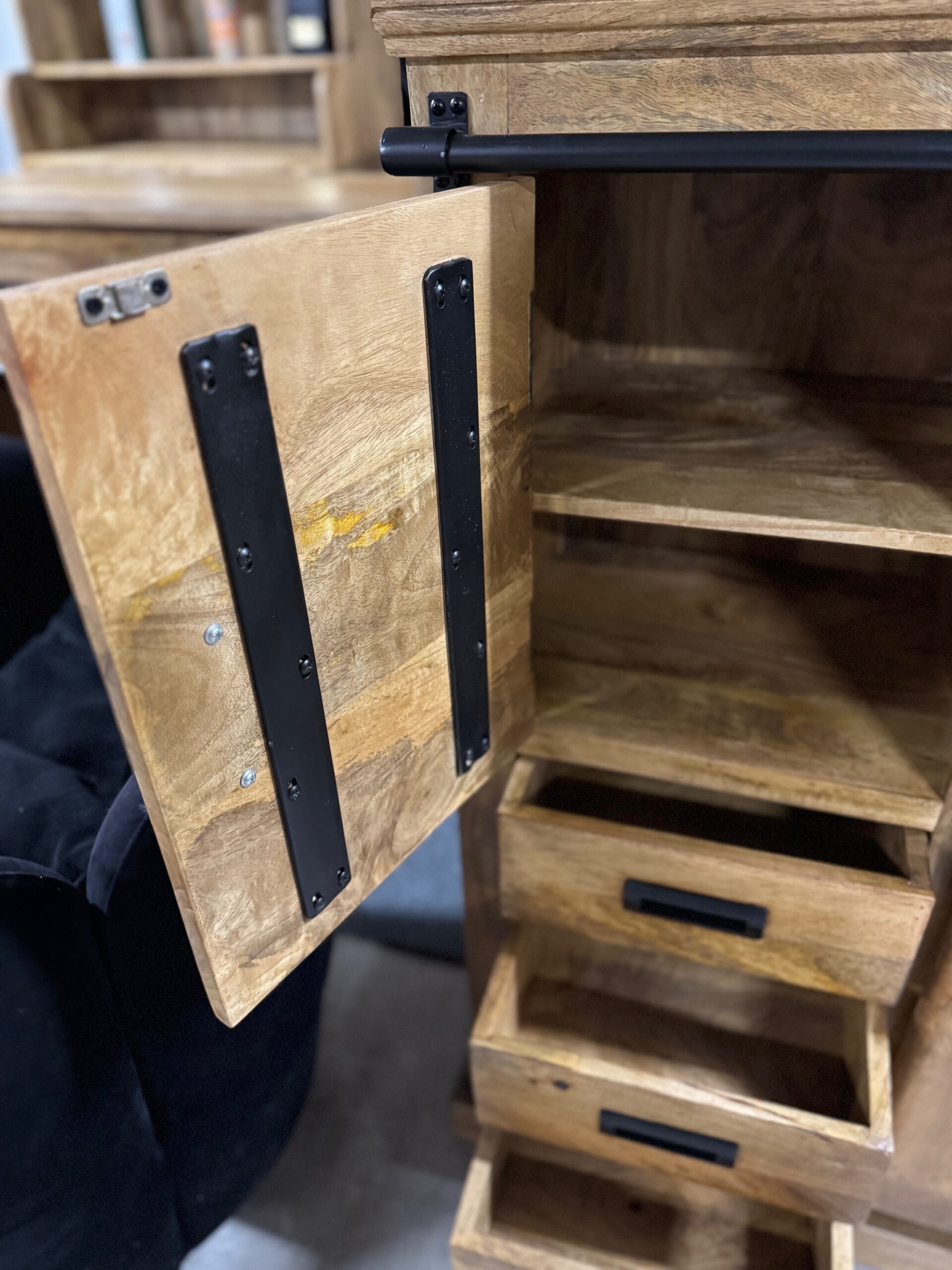 Każdy element kolekcji — od masywnych komód po stylowe regały i szafki — został wykonany ręcznie z litego, naturalnego drewna mango, którego unikalne usłojenie nadaje każdemu meblowi indywidualny, niepowtarzalny wygląd. Czarne stalowe detale i przesuwne drzwi na prowadnicach inspirowane są stylem przemysłowych warsztatów, co tworzy wyjątkowy kontrast pomiędzy surowością metalu a ciepłem drewna.