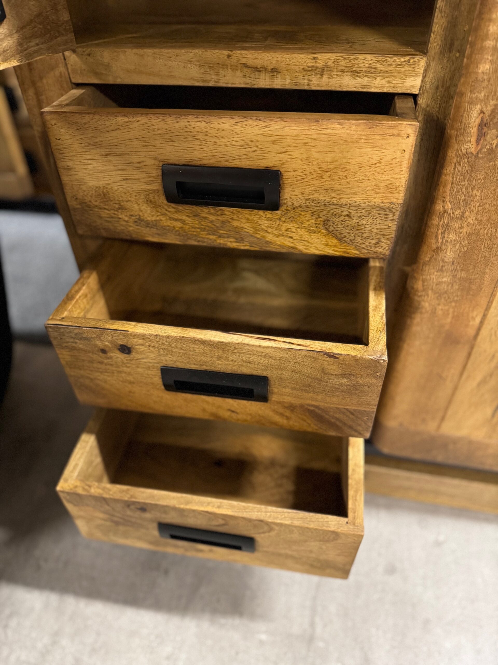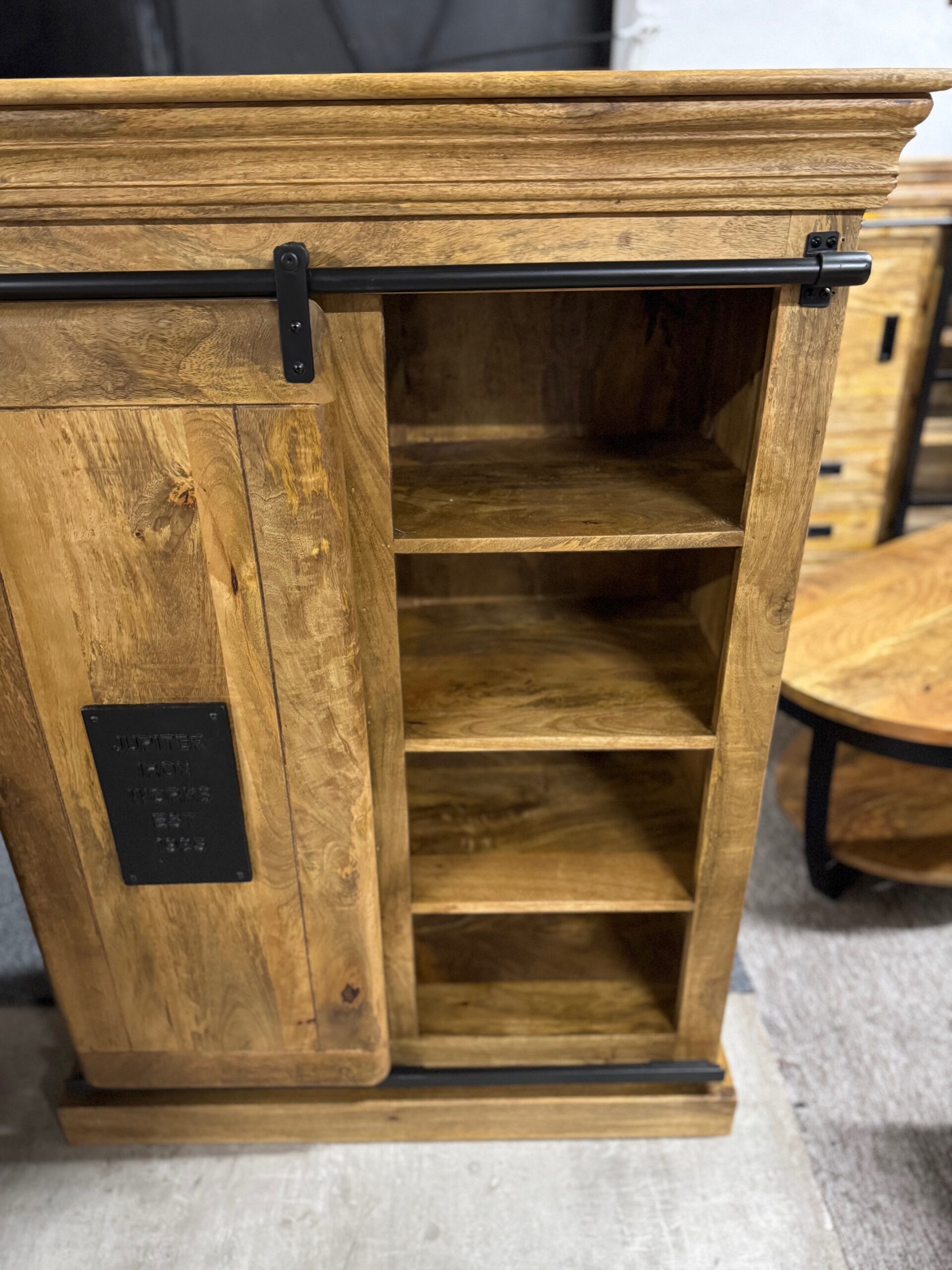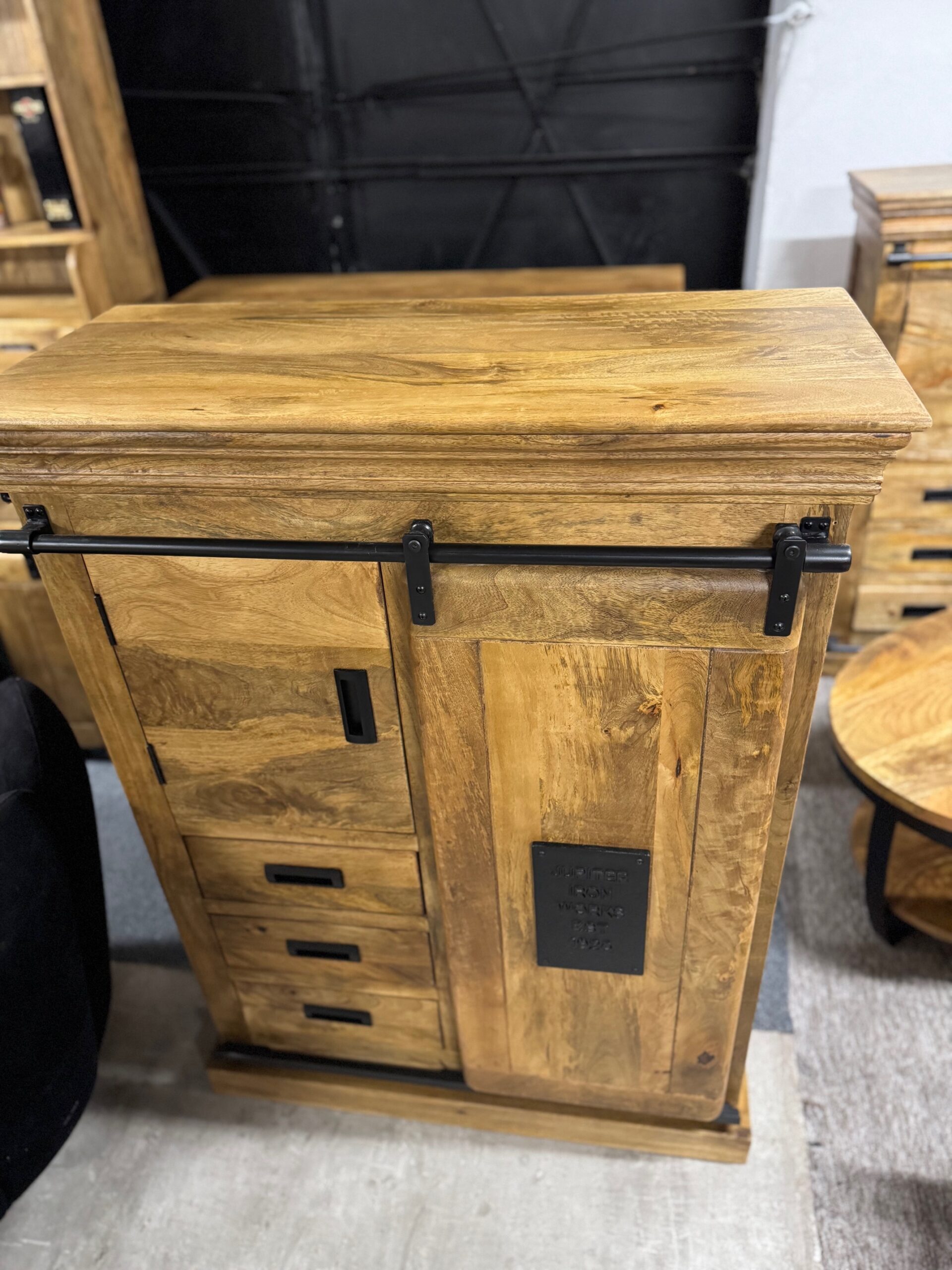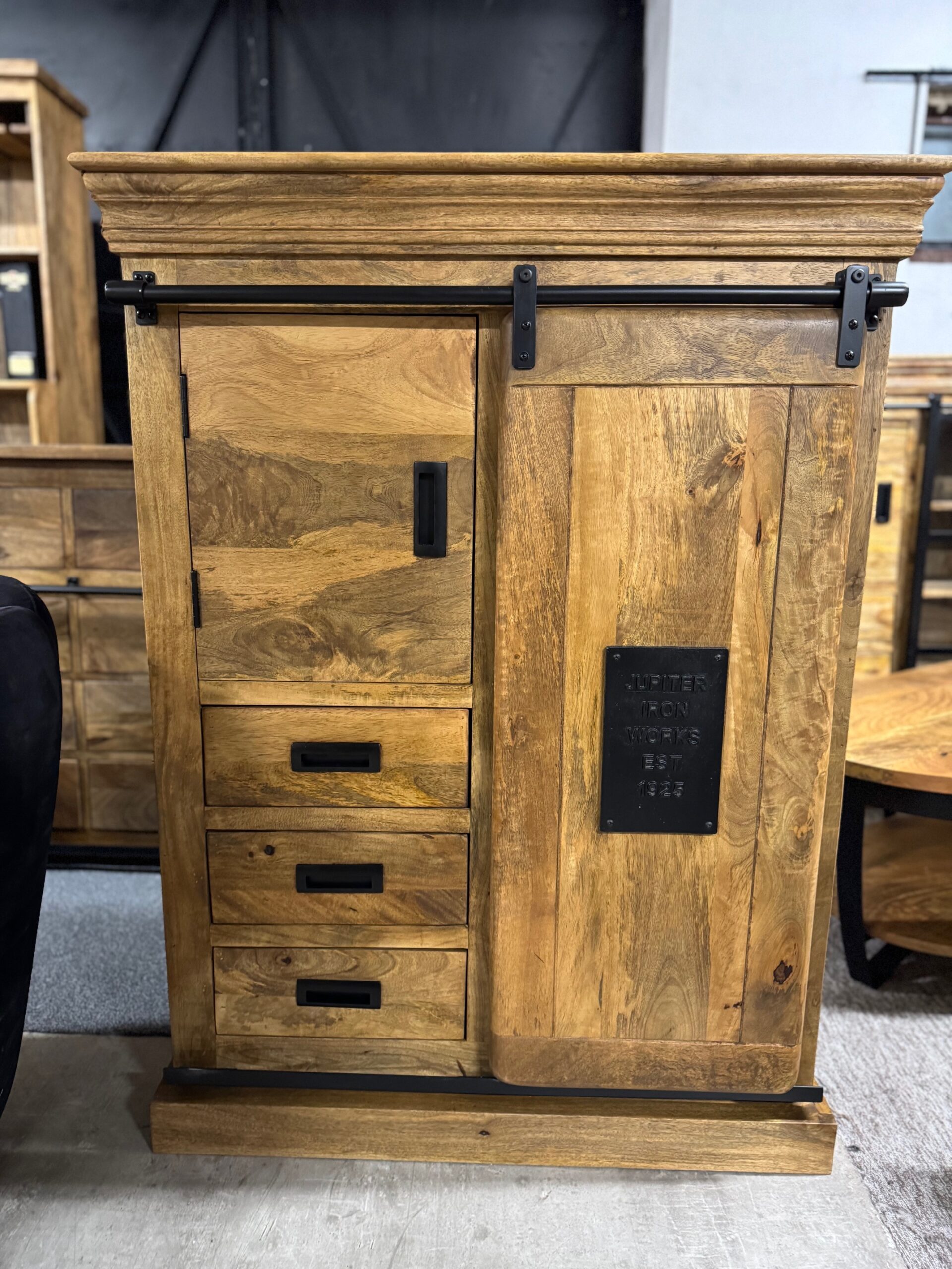 Każdy element kolekcji — od masywnych komód po stylowe regały i szafki — został wykonany ręcznie z litego, naturalnego drewna mango, którego unikalne usłojenie nadaje każdemu meblowi indywidualny, niepowtarzalny wygląd. Czarne stalowe detale i przesuwne drzwi na prowadnicach inspirowane są stylem przemysłowych warsztatów, co tworzy wyjątkowy kontrast pomiędzy surowością metalu a ciepłem drewna.