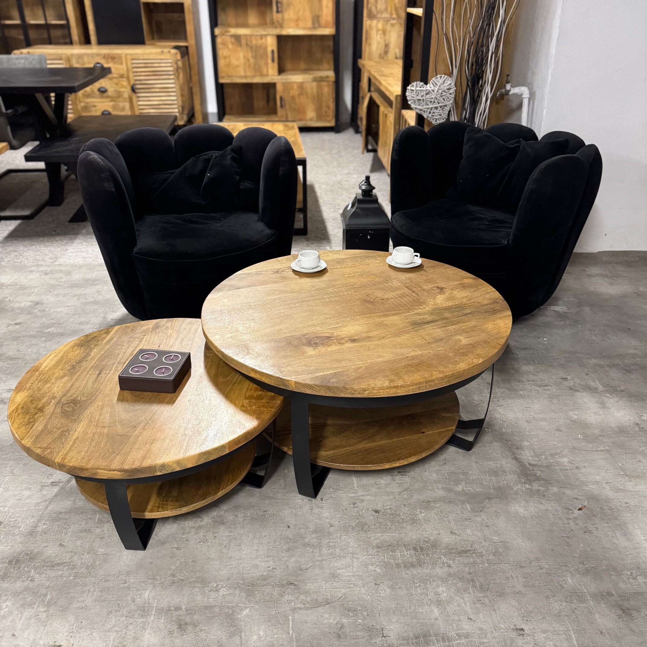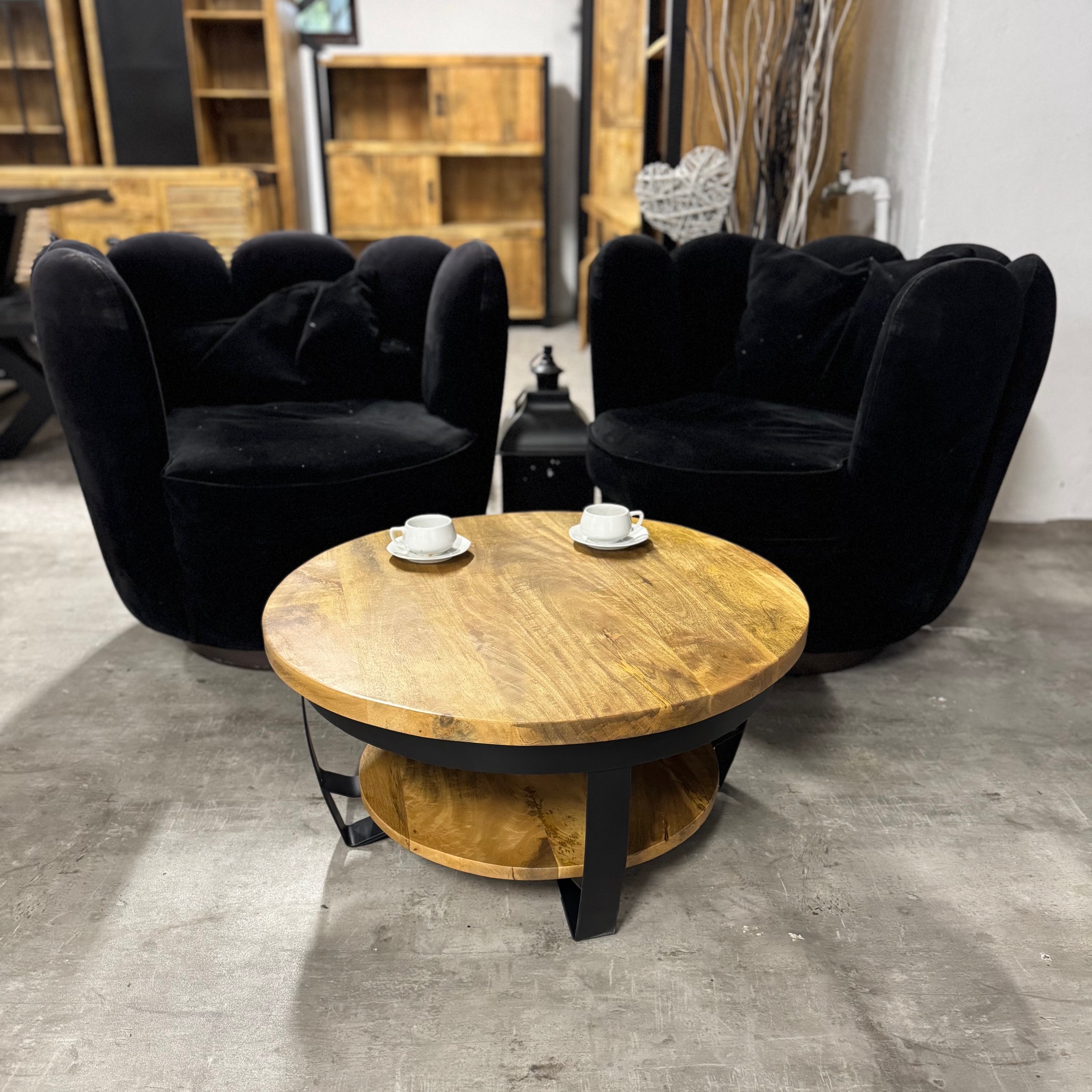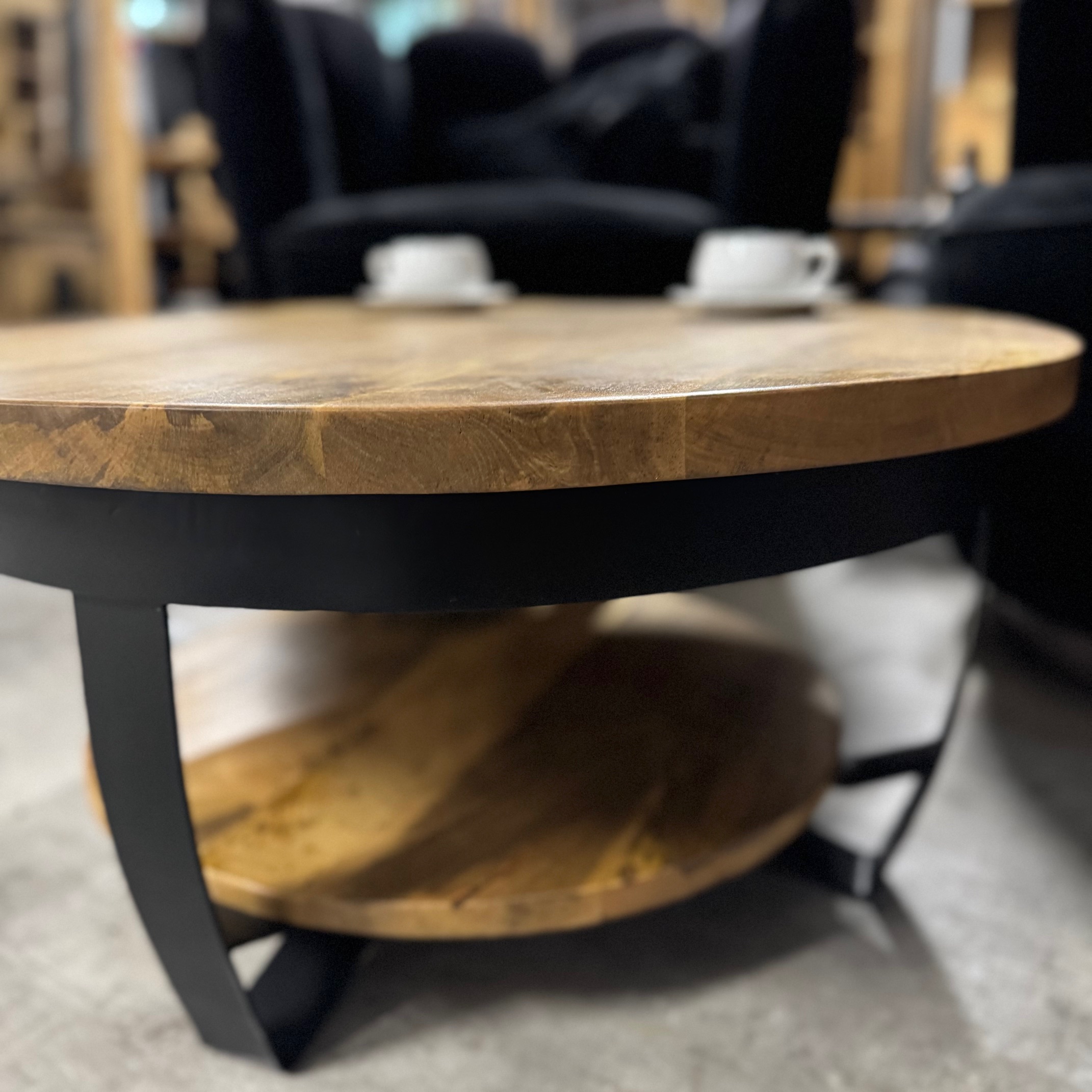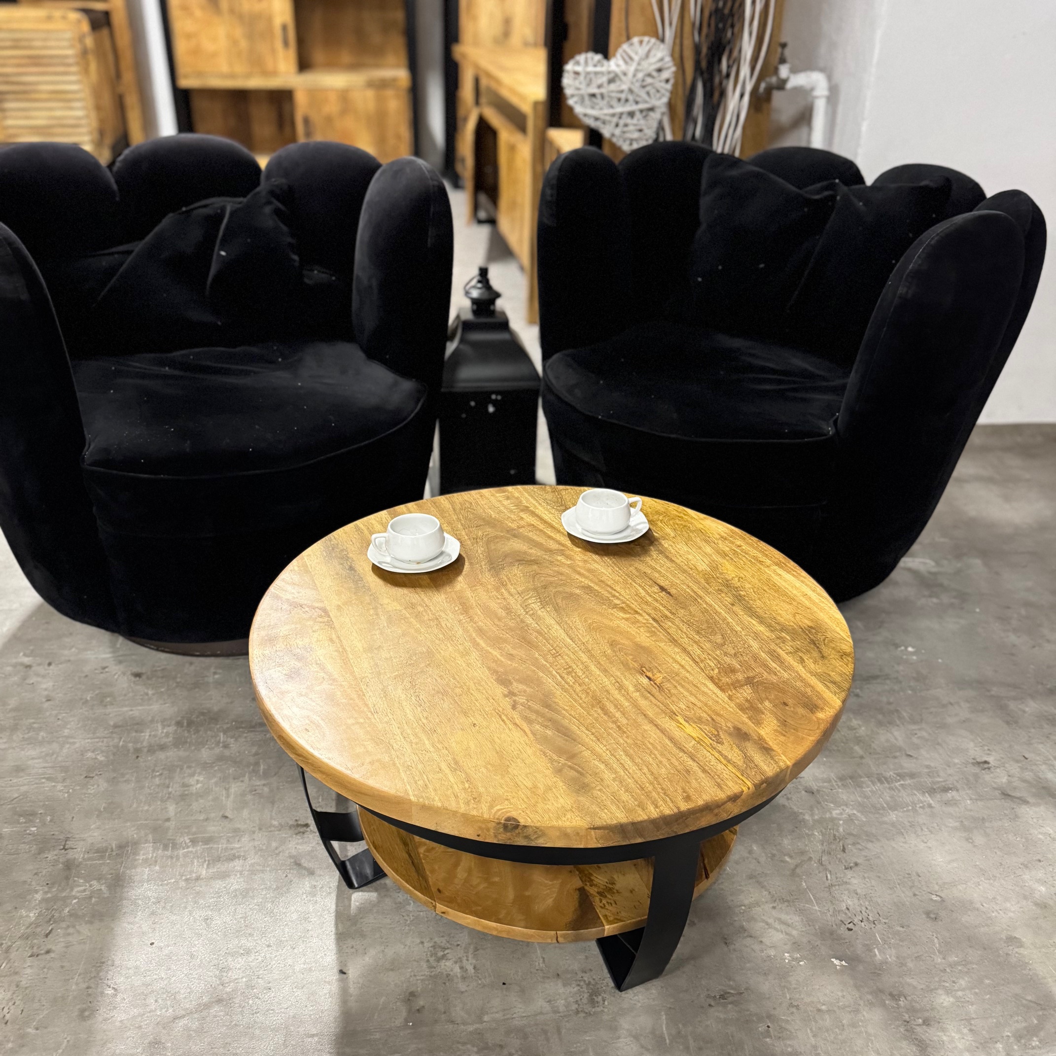 Stylowy okrągły stolik do salonu Naturalne drewno mango od MangoMeble wnosi ciepły, naturalny akcent do każdego wnętrza. Okrągły blat z litego, naturalnego drewna mango z widocznym usłojeniem sprawia, że ​​ten kompaktowy stolik kawowy emanuje czystą prostotą i ponadczasowym urokiem. Elegancka metalowa podstawa jest lekka i elegancka, idealna do stworzenia lekkiej atmosfery bez uszczerbku dla solidności.