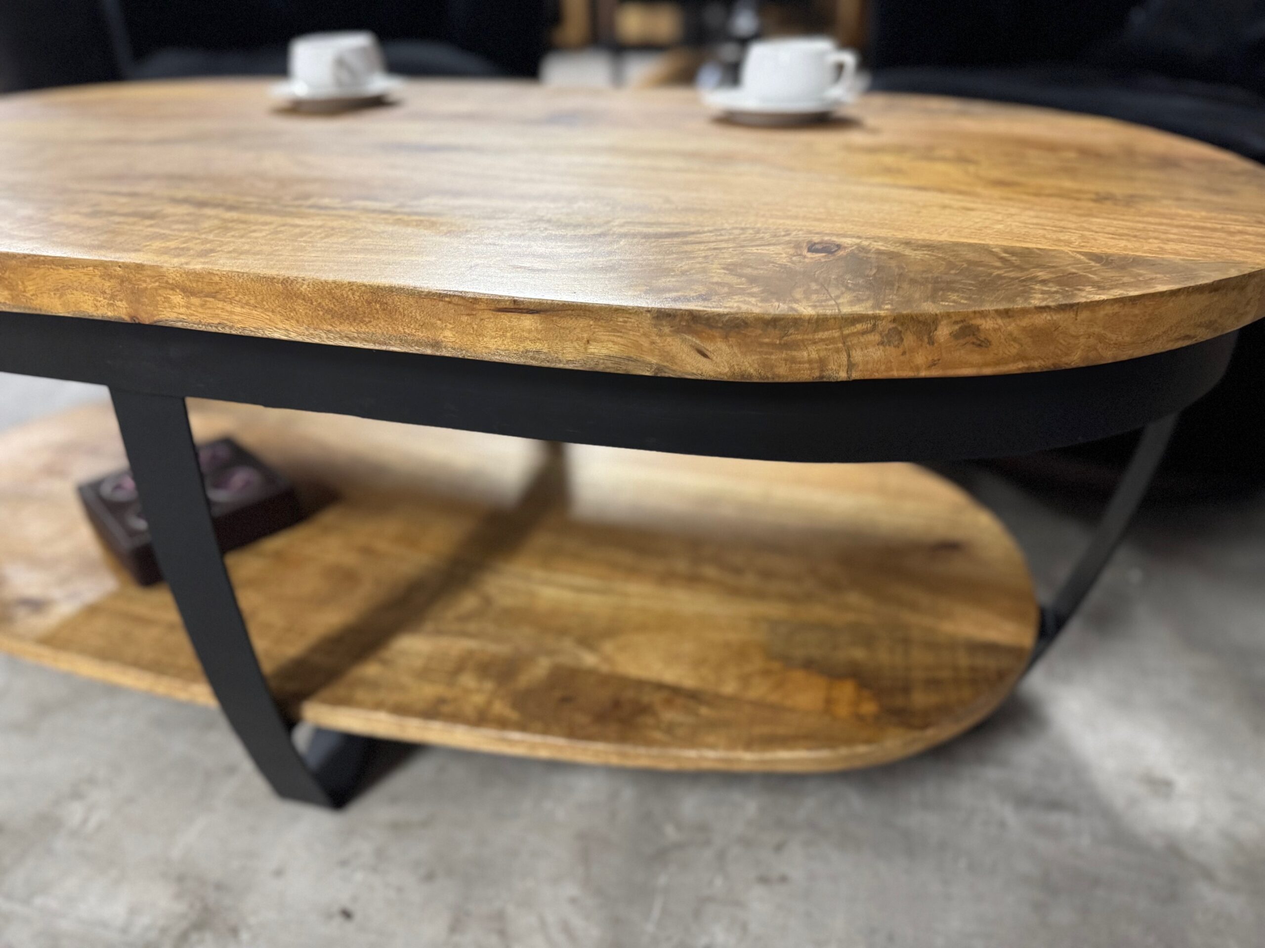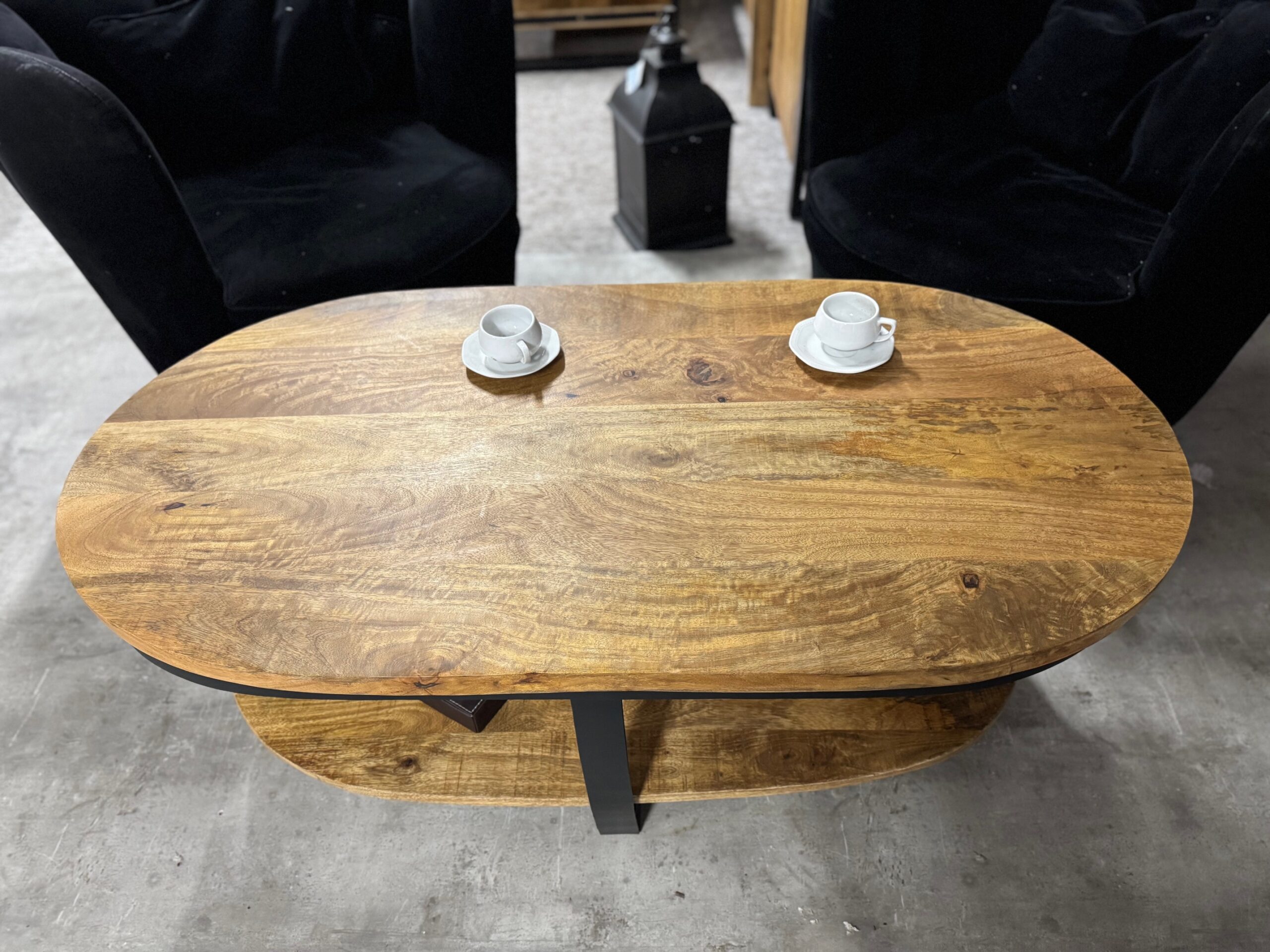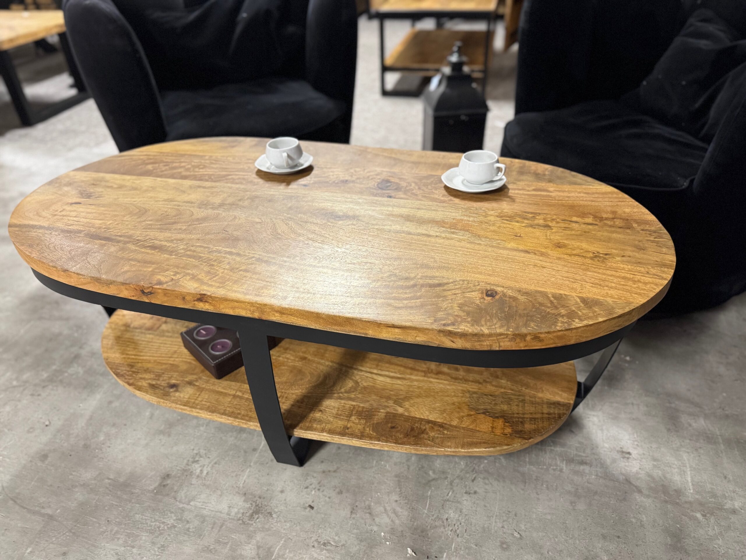 Nasz owalny stolik do salonu posiada blat o długości 120cm wykonany z naturalnego drewna mango. Metalowe nogi są lakierowane proszkowo na czarno, co nadaje im loftowy i nowoczesny wygląd.