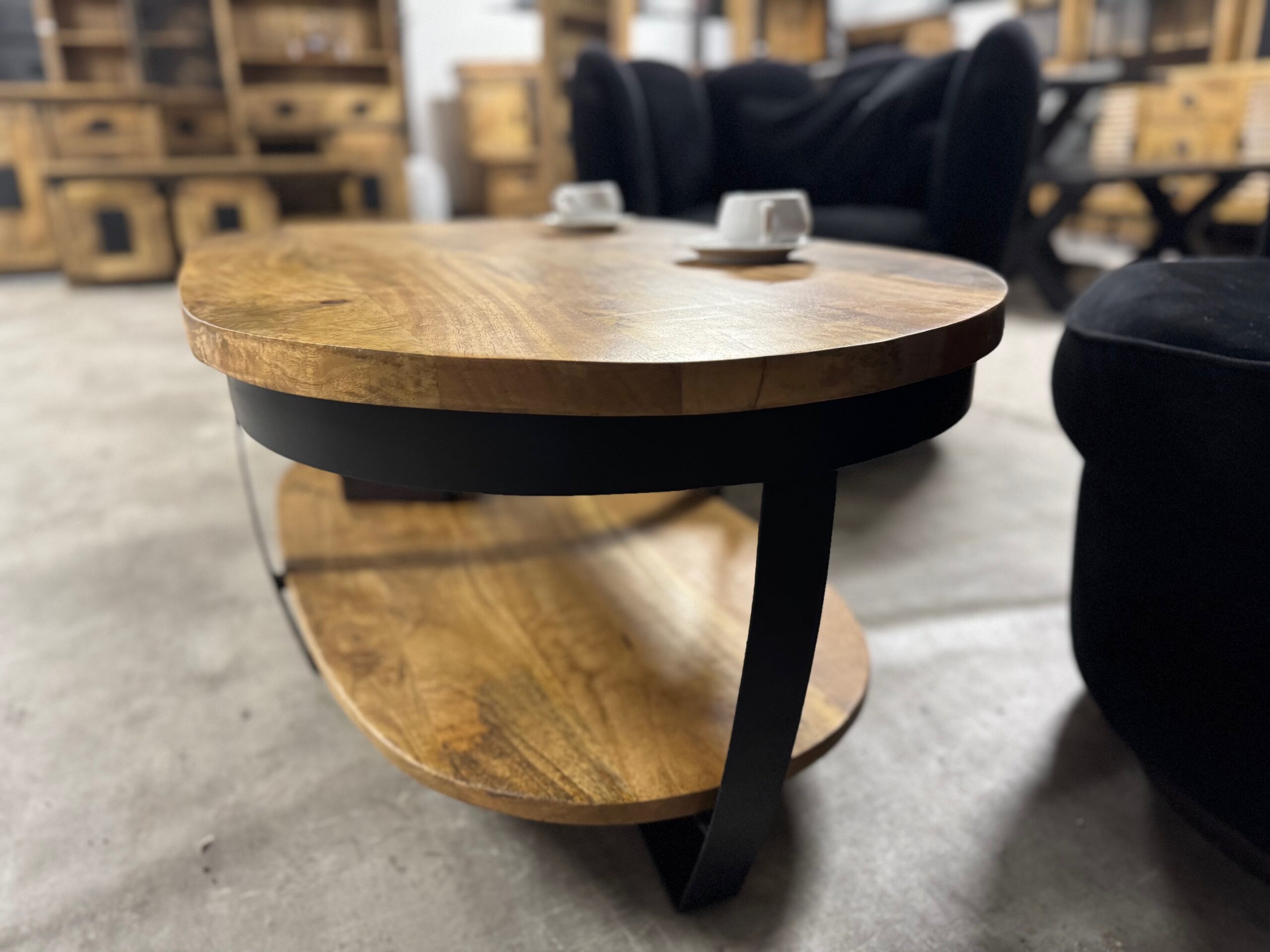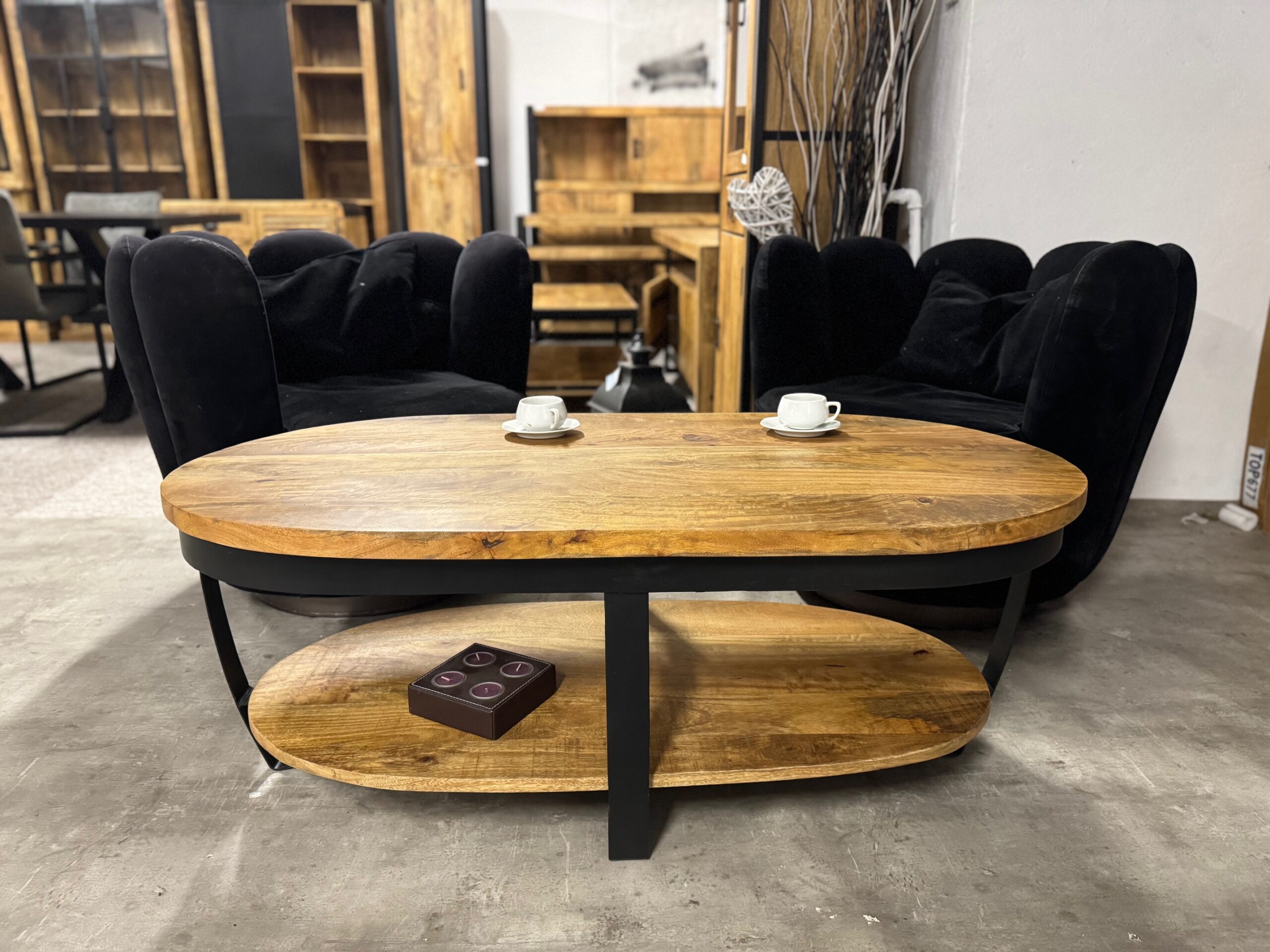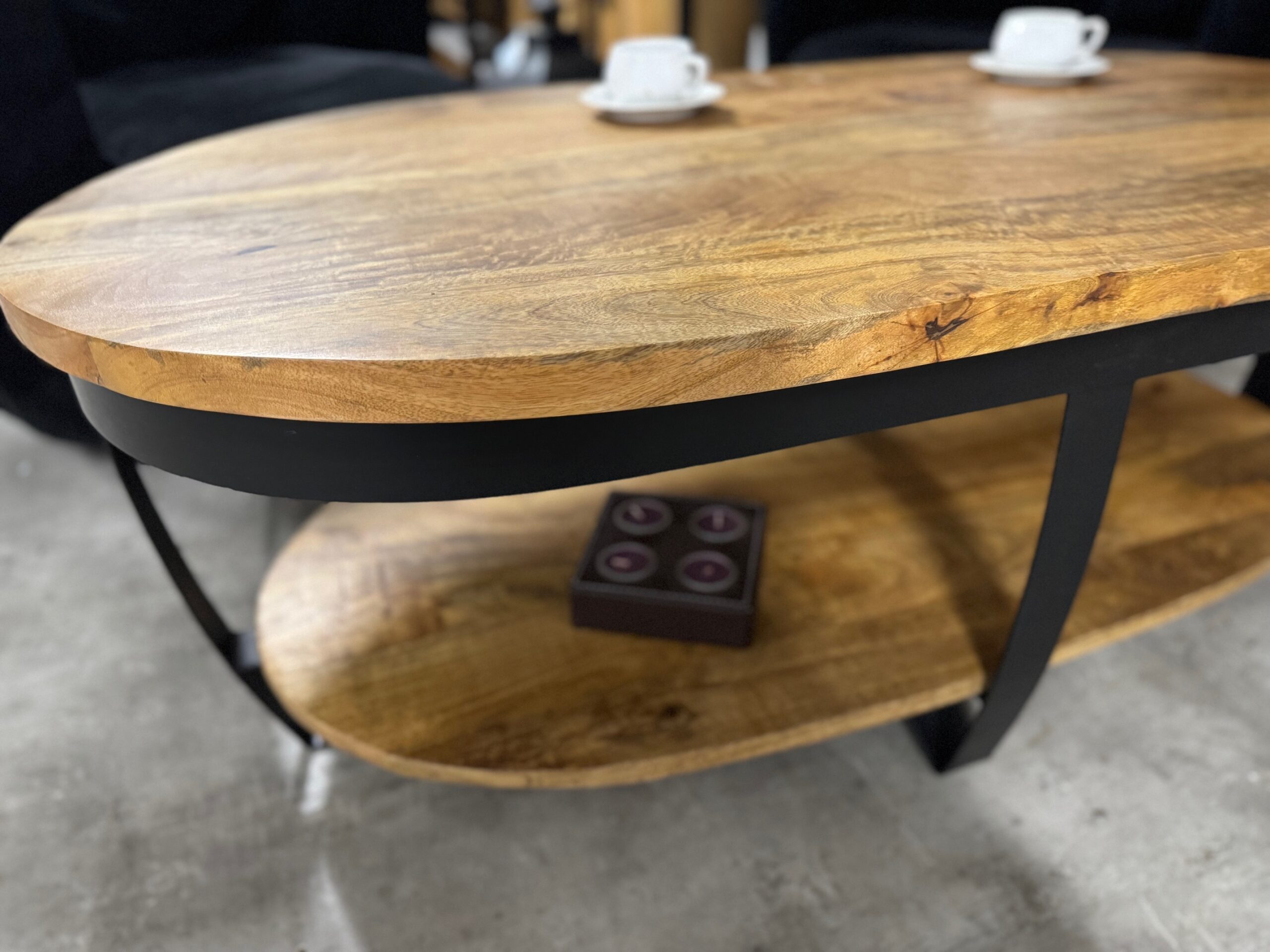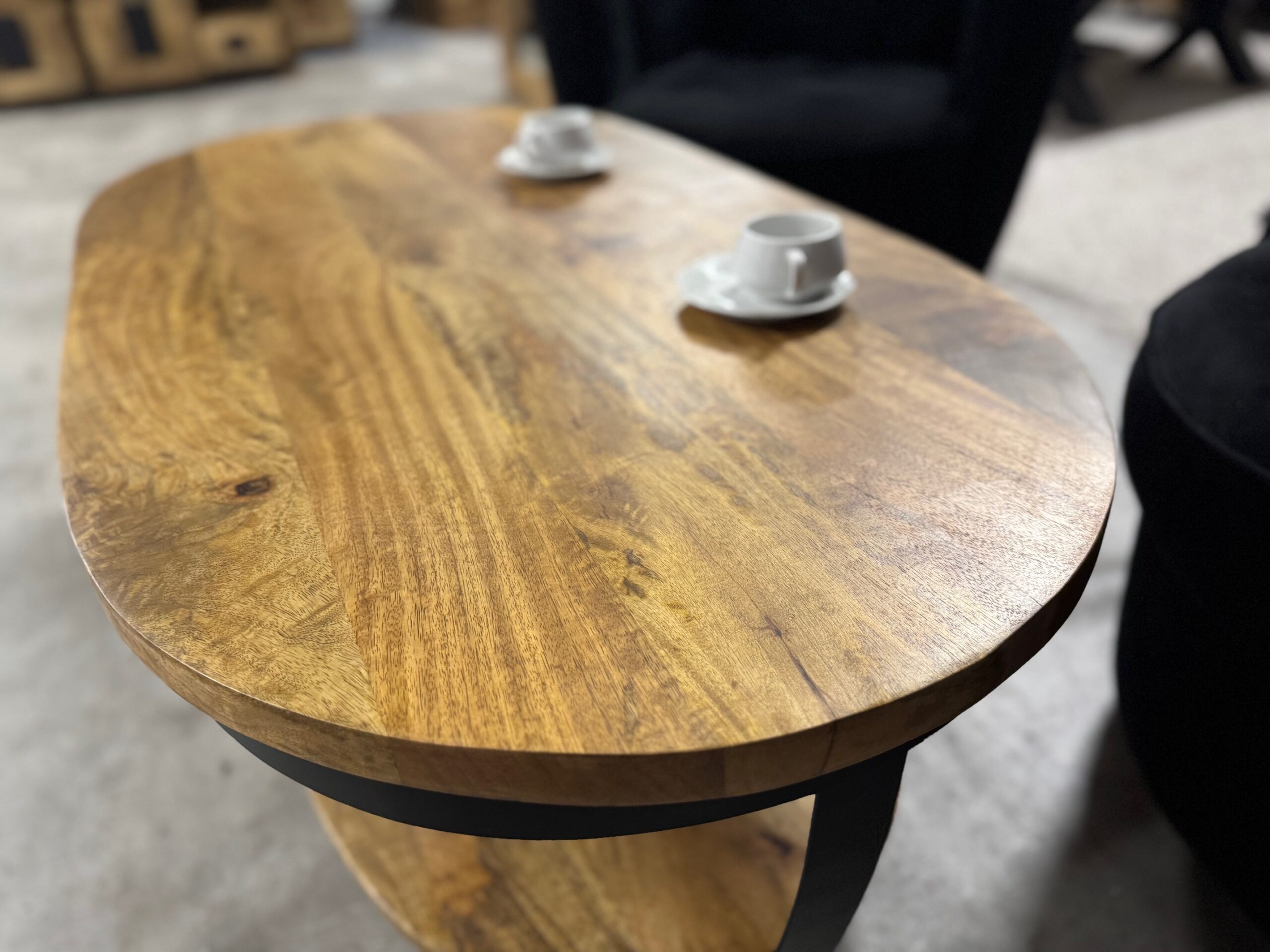 Nasz owalny stolik do salonu posiada blat o długości 120cm wykonany z naturalnego drewna mango. Metalowe nogi są lakierowane proszkowo na czarno, co nadaje im loftowy i nowoczesny wygląd.