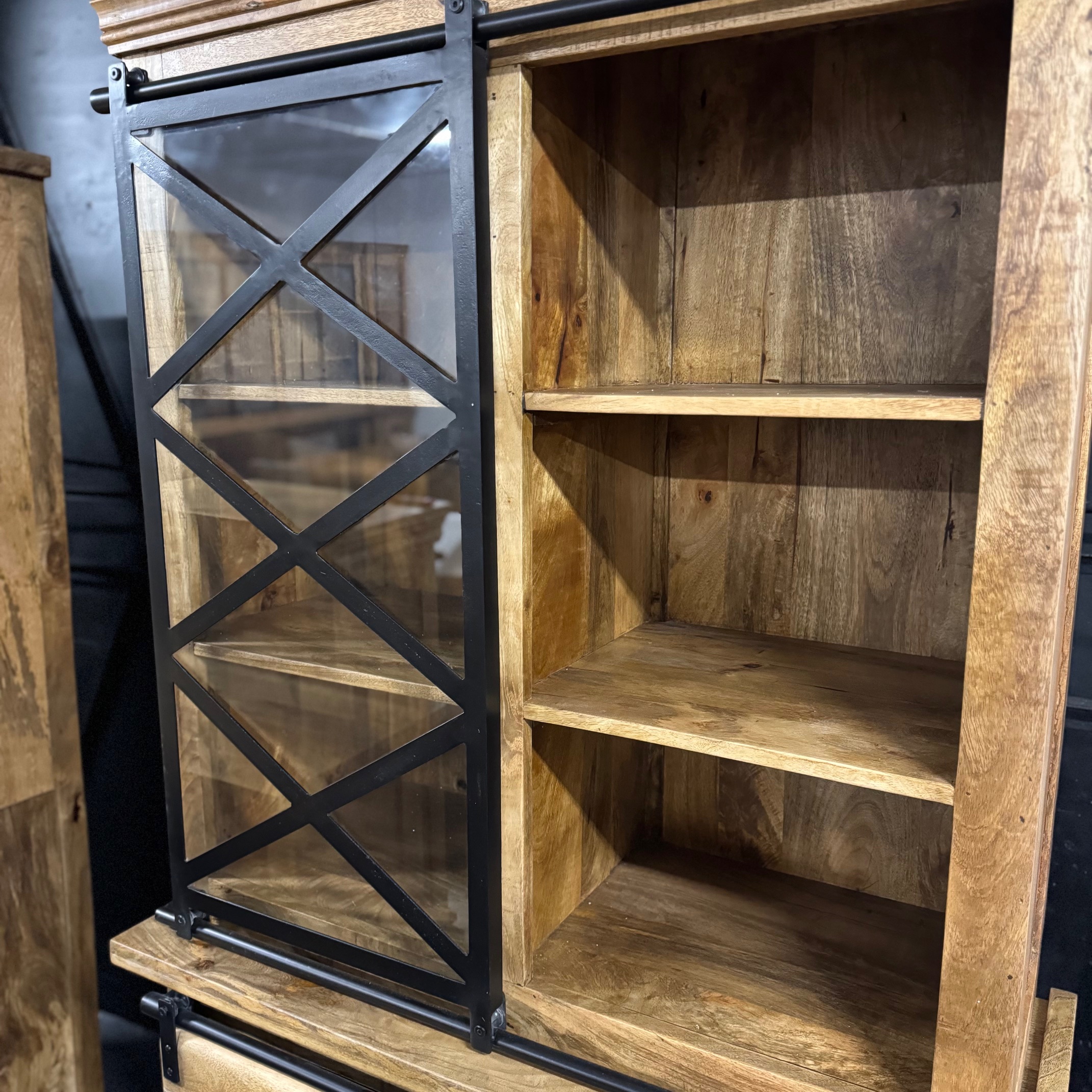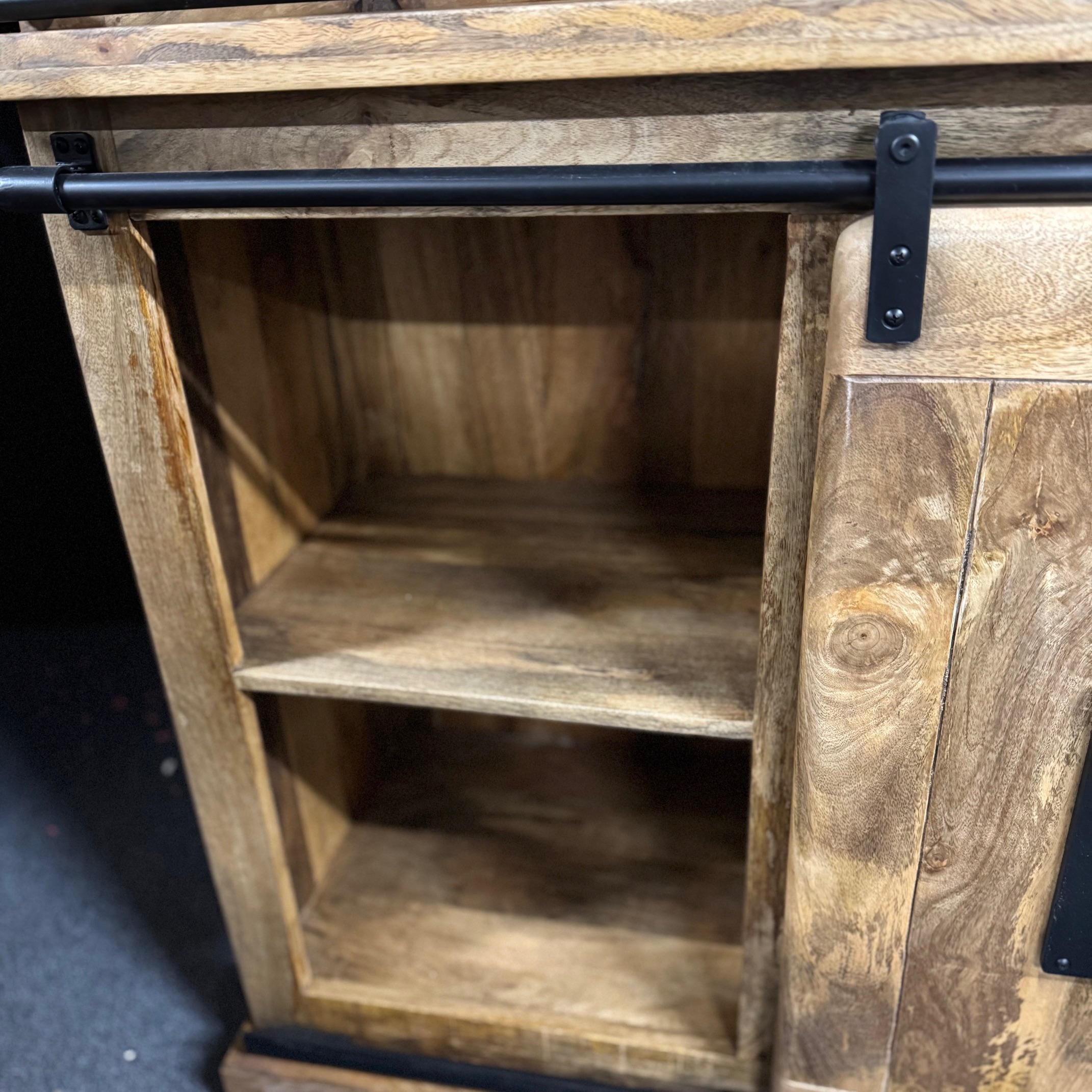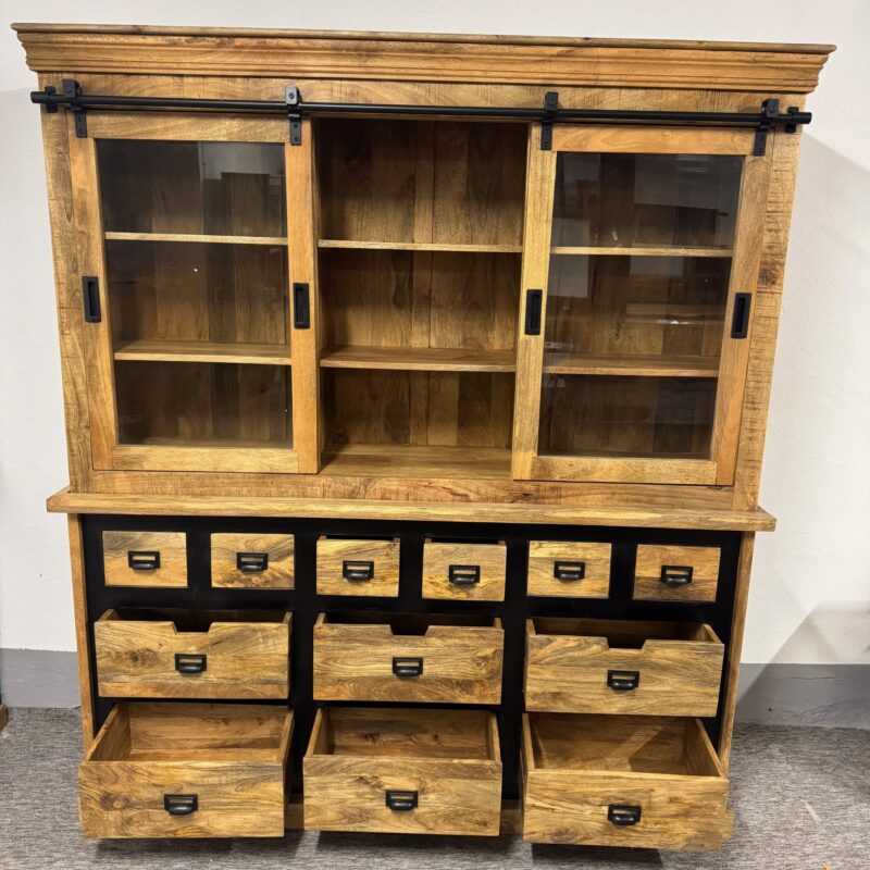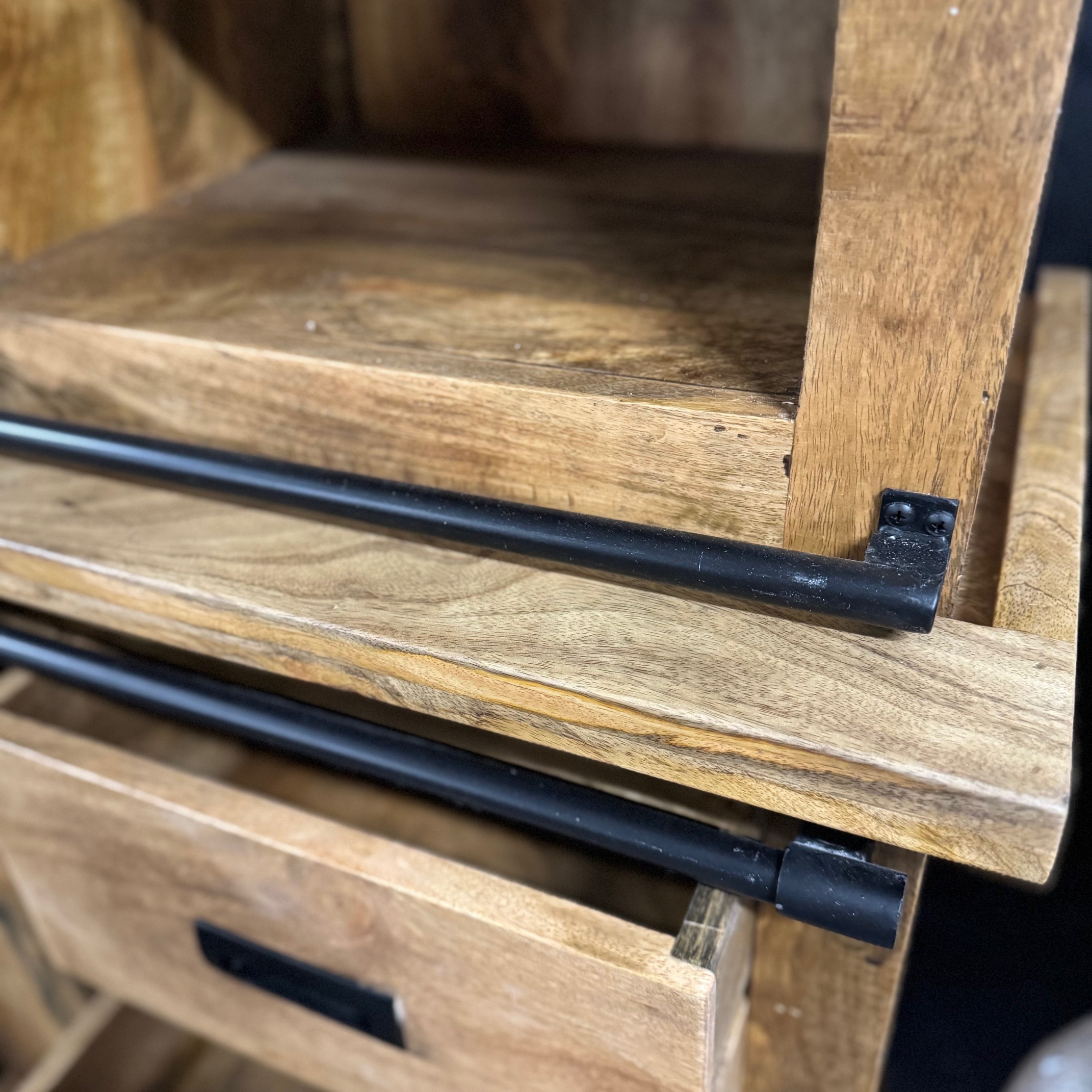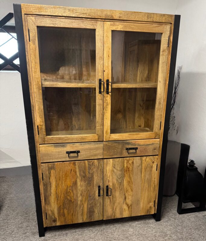 Lite drewno mango jest impregnowane kilkoma warstwami oleju do drewna i bezbarwnym, naturalnym woskiem pszczelim, aby chronić je przed wilgocią, brudem i plamami. Ramy przesuwanych drzwi szklanych, dolne drzwi przesuwne oraz uchwyty wykonane są z czarnego metalu malowanego proszkowo.