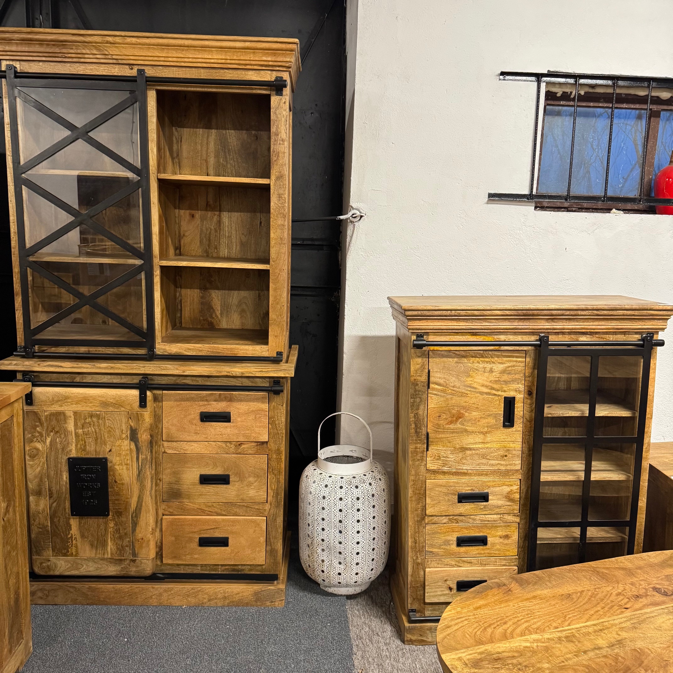 Ten drewniany bufet jest również dostępny w różnych szerokościach oraz szyny bez ramy w kształcie litery X, a także z podwójnymi drzwiami przesuwnymi. Nasza seria komód z serii Works jest również dostępna w szerokościach od 140 cm do 260 cm i idealnie komponuje się z innymi meblami serii Works!