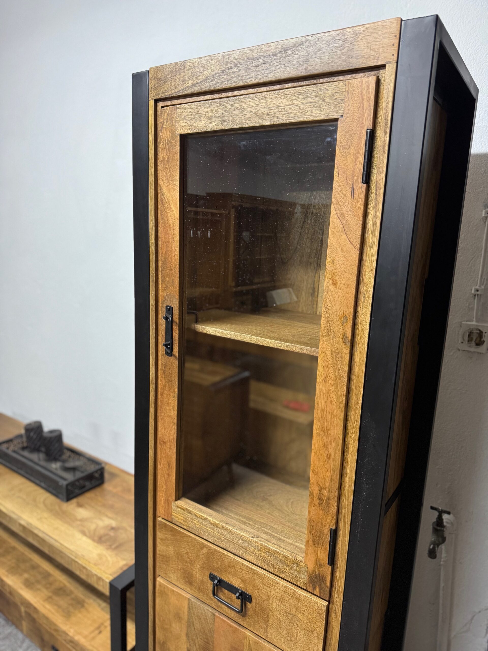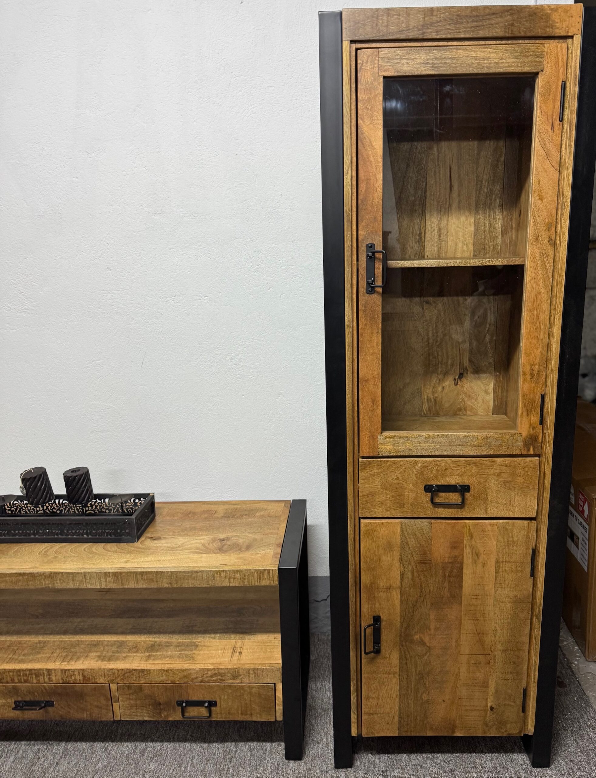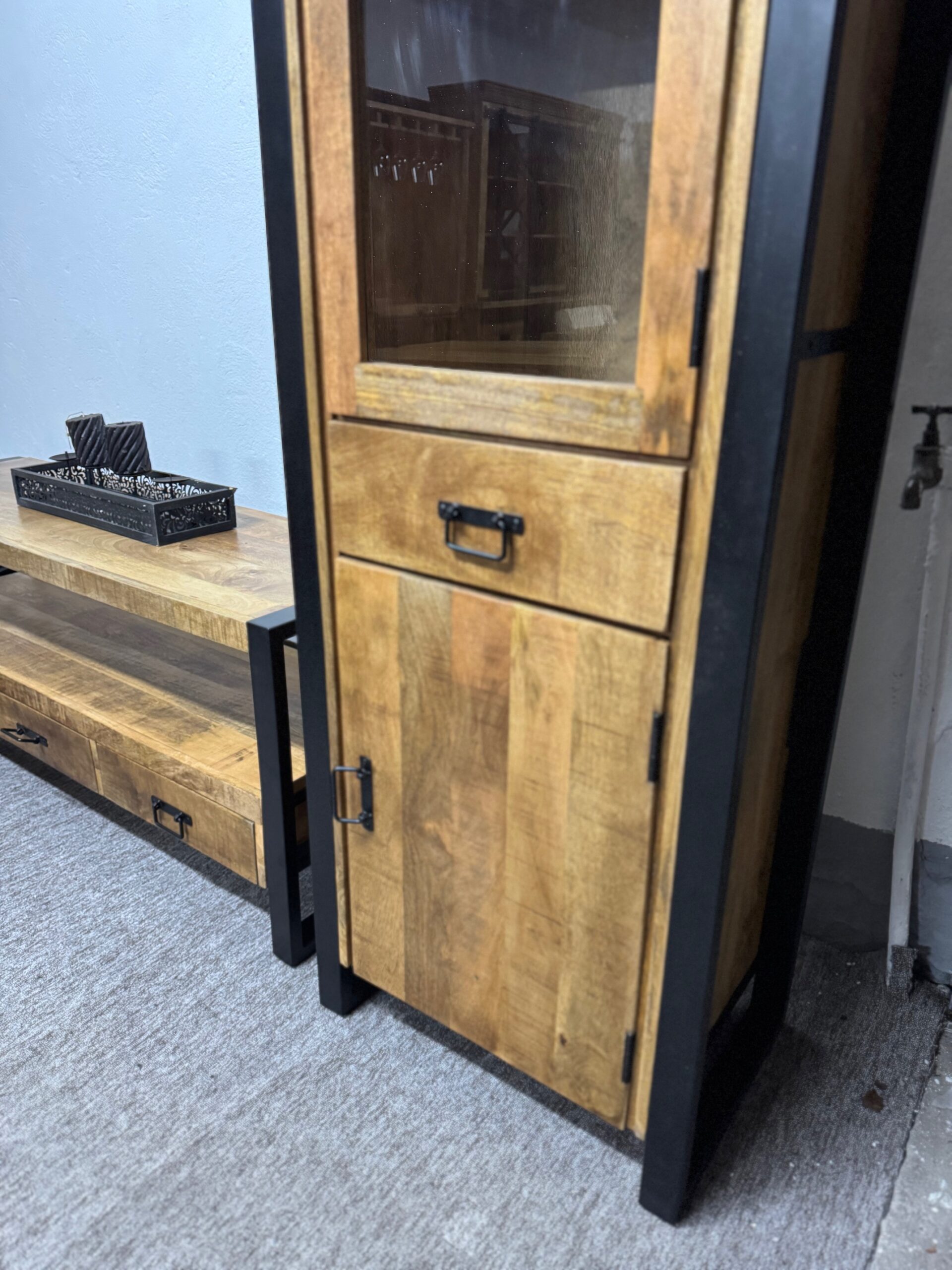Witryna Britt ma matową, czarną ramę, która w połączeniu z ciepłym drewnem mango tworzy idealny wygląd do nowoczesnego lub industrialnego wnętrza.