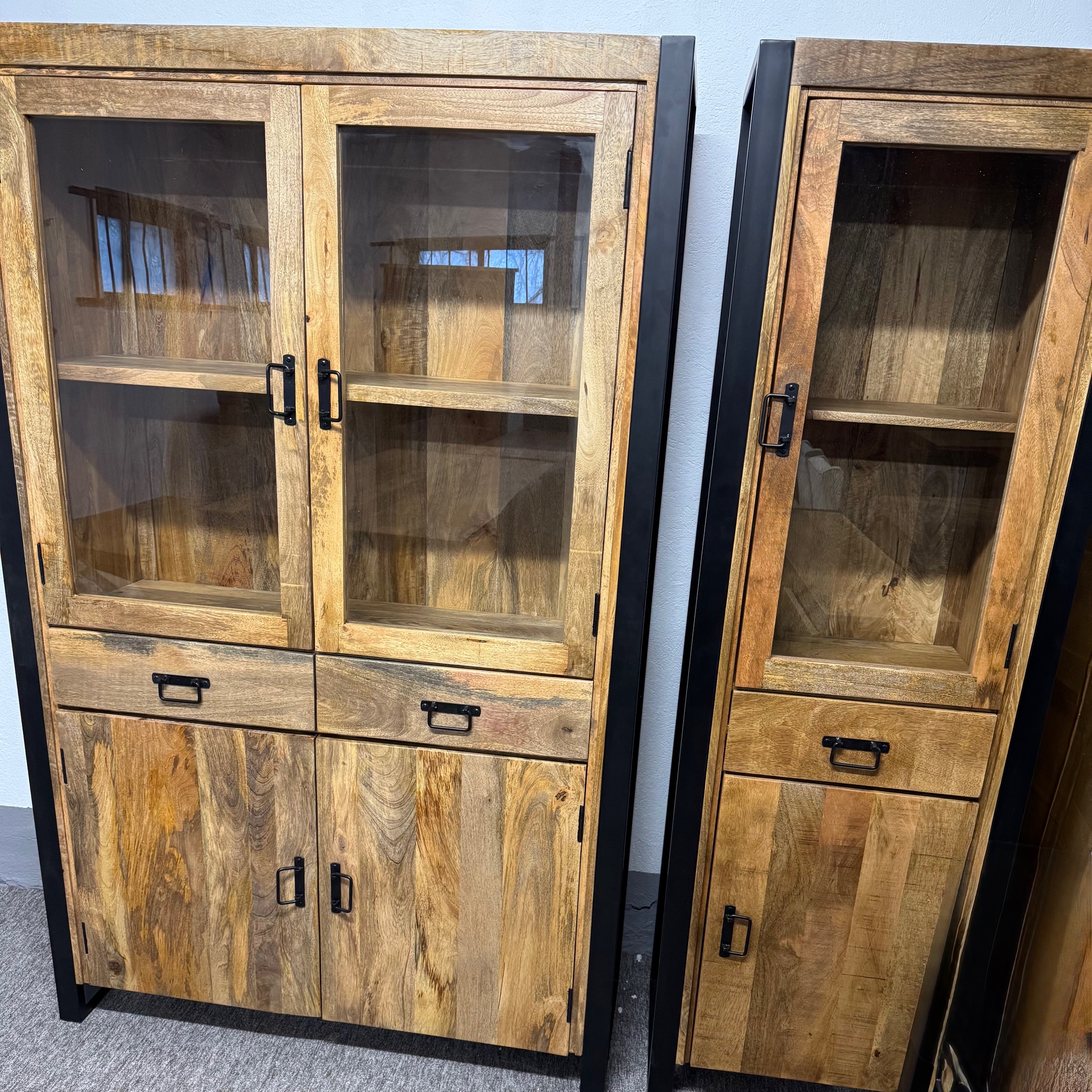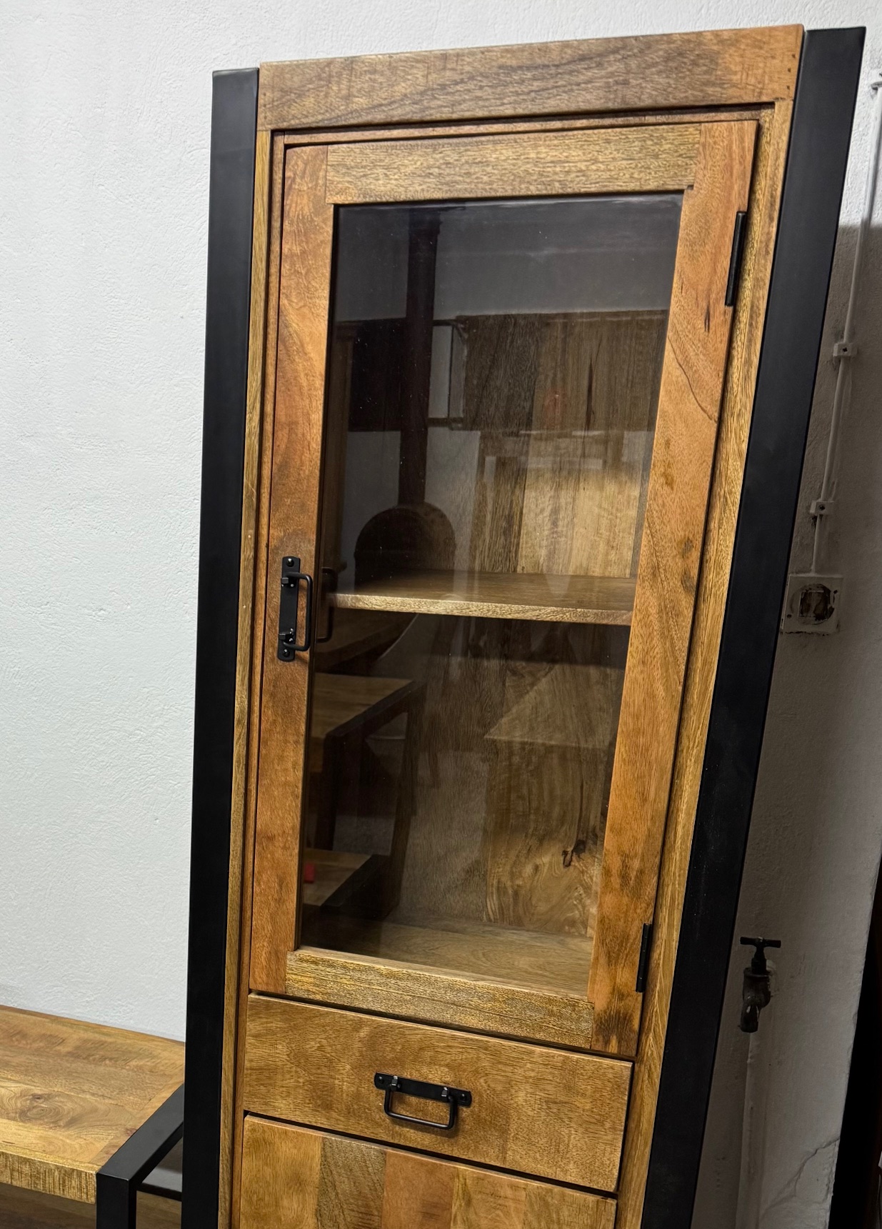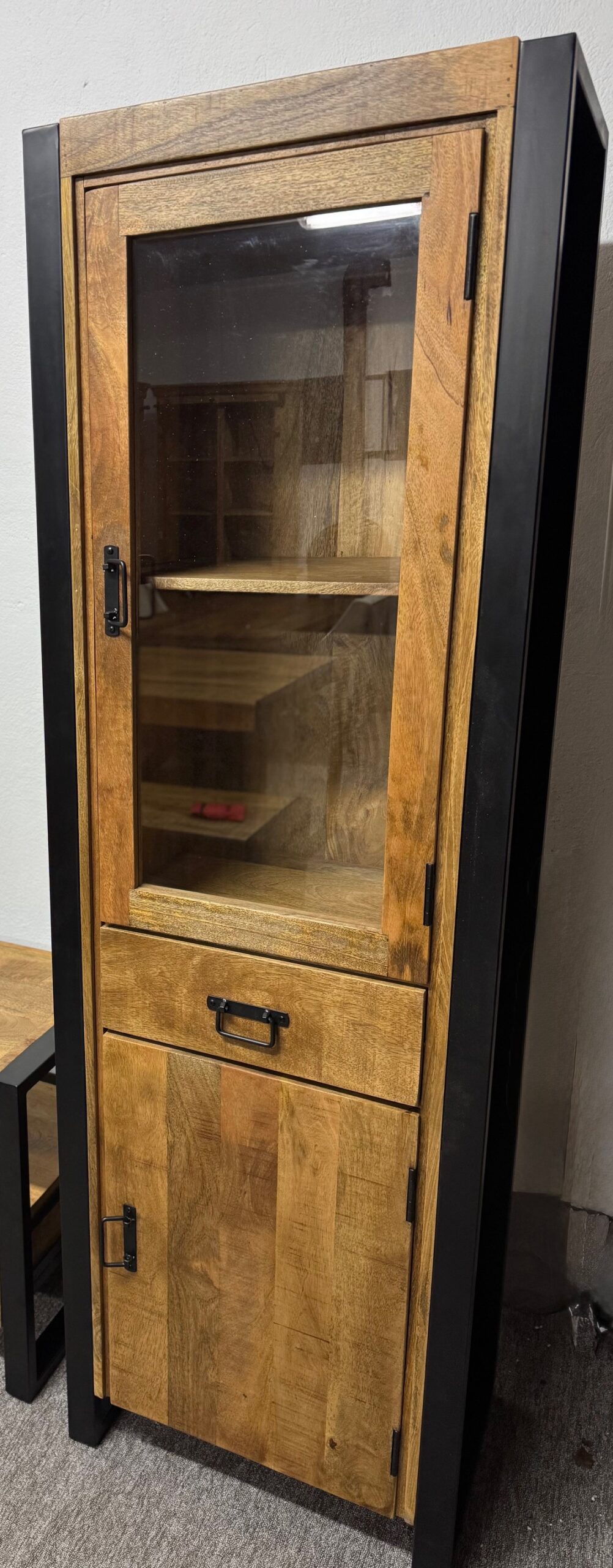 Witryna Britt ma matową, czarną ramę, która w połączeniu z ciepłym drewnem mango tworzy idealny wygląd do nowoczesnego lub industrialnego wnętrza.